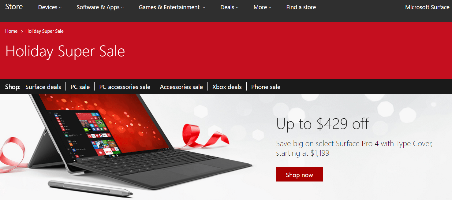 Microsoft store is having a huge super sale. You can save as much as $400 on a high-end Surface Book. Check it out. Other deals include this awesome one on the Xbox One S: Save $50 on every new Xbox One S bundle purchase through Dec. 24 and that Xbox One S purchase will come with a $30 gift card from participating retailers, including Microsoft Store, Amazon, and Target.